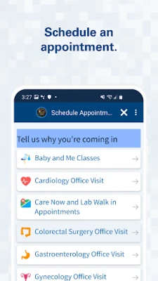 MANAGE APPOINTMENTS Browse available appointments and schedule right from the app. Log in anytime to view details for upcoming and past appointments. Take advantage of eCheck-In where available and cancel appointments you can’t make.