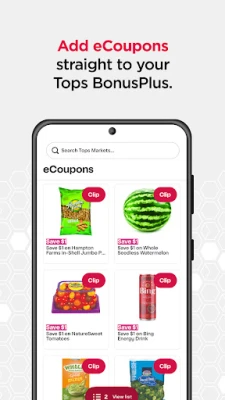 • Browse and shop our weekly ad • Enjoy contactless shopping with Tops Grocery Pickup or Delivery • Clip digital coupons directly to your Tops BonusPlus card • Easily re-order your favorite items from pervious purchases • Search for your favorite items or browse by department • View additional product details, nutrition facts, and package images • Create and save weekly shopping lists • Quickly access your Tops BonusPlus card